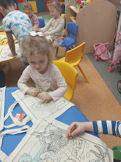 W tym tygodniu nasze zajęcia i zabawy dotyczą dinozaurów. Jest w nich coś magicznego i wspaniałego, co zachęca i interesuje dzieci. Przedszkolaki poznały wygląd różnych dinozaurów, powtarzały ich trudne nazwy i poznały wiele ciekawostek na temat zwierząt, które żyły bardzo dawno temu. W ramach zajęć plastycznych każde dziecko mogło pomalować materiałową torbę z nadrukiem dinozaurów. Pomysł bardzo się podobał dzieciom, niektórzy następnego dnia zastąpili plecaki własnoręcznie wymalowanymi, ekologicznymi torbami. :)